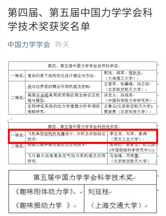 李玉龙教授及其科研团队主持或参与的多个机型抗鸟撞结构设计项目,参与成飞、623所、606所等多家航空院所鸟撞地面模拟试验系统研制,曾获得国防科技进步二等奖、中航集团科技进步二等奖等多项奖励。团队提出的发动机抗鸟撞方案设计获得多项专利,并实现国内首次航空发动机风扇叶片旋转状态下鸟撞试验;机翼前缘“双斜板”抗鸟撞设计方案获得国内外多项专利,并实际运用于ARJ21等国产机型。