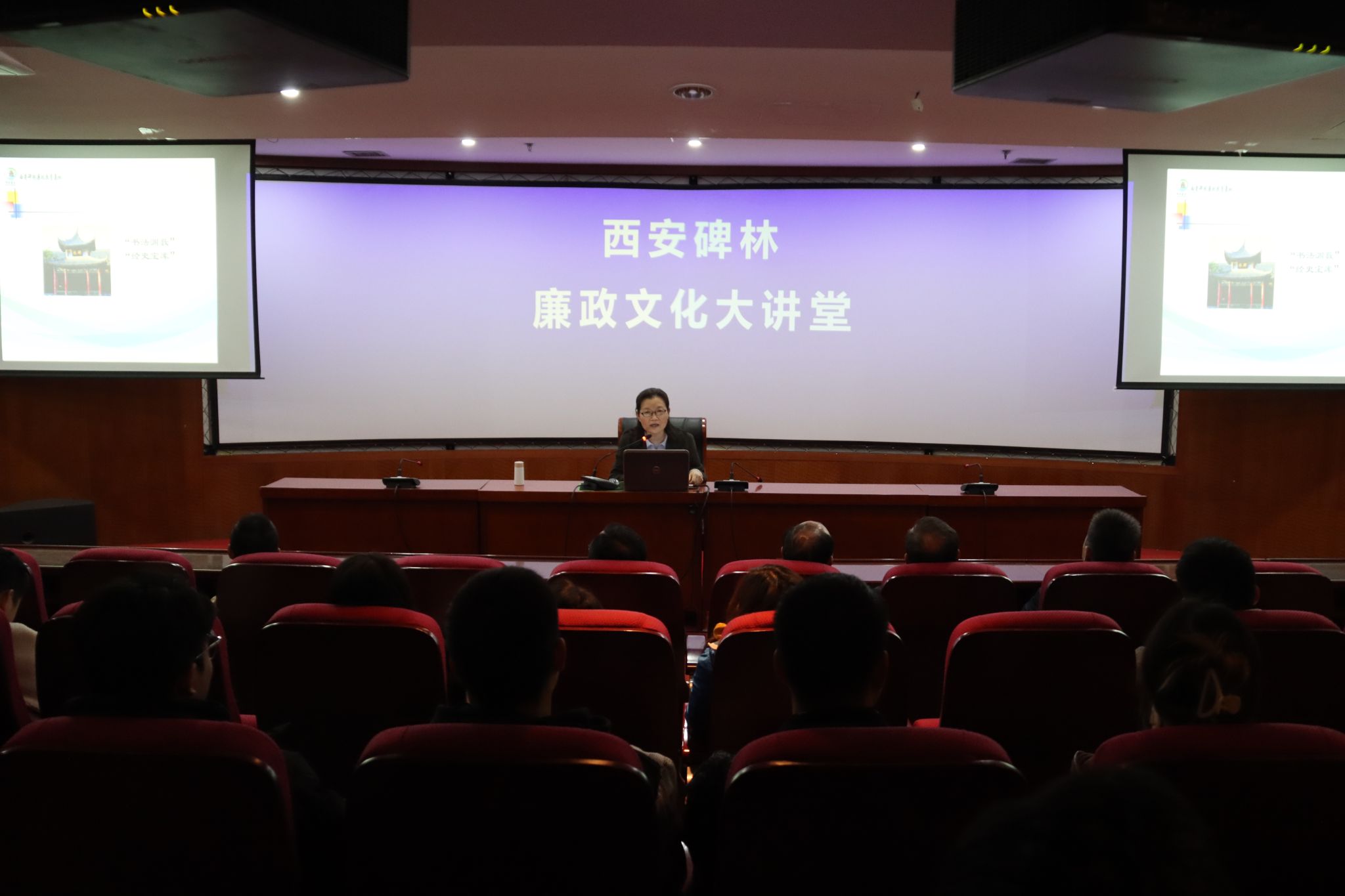在廉政文化大讲堂上,大家集中观看了廉政教育宣传片《清风正气 镂石成金》,聆听了碑林廉政教育基地研究员所作的廉政文化讲座《儒有澡身而浴德——漫话碑林文化之廉政思想》。随后,在讲解人员的带领下,大家逐一观看了碑林中有关廉政方面的碑文,感悟每一方碑文后所讲述的故事、蕴含的哲理,加深了对“吏不畏吾严而威吾廉,民不服吾能而服吾公”“苟利国家生死以,岂因福祸避趋之”等廉政名言警句所蕴含的爱岗敬业、廉洁奉公情怀的理解。