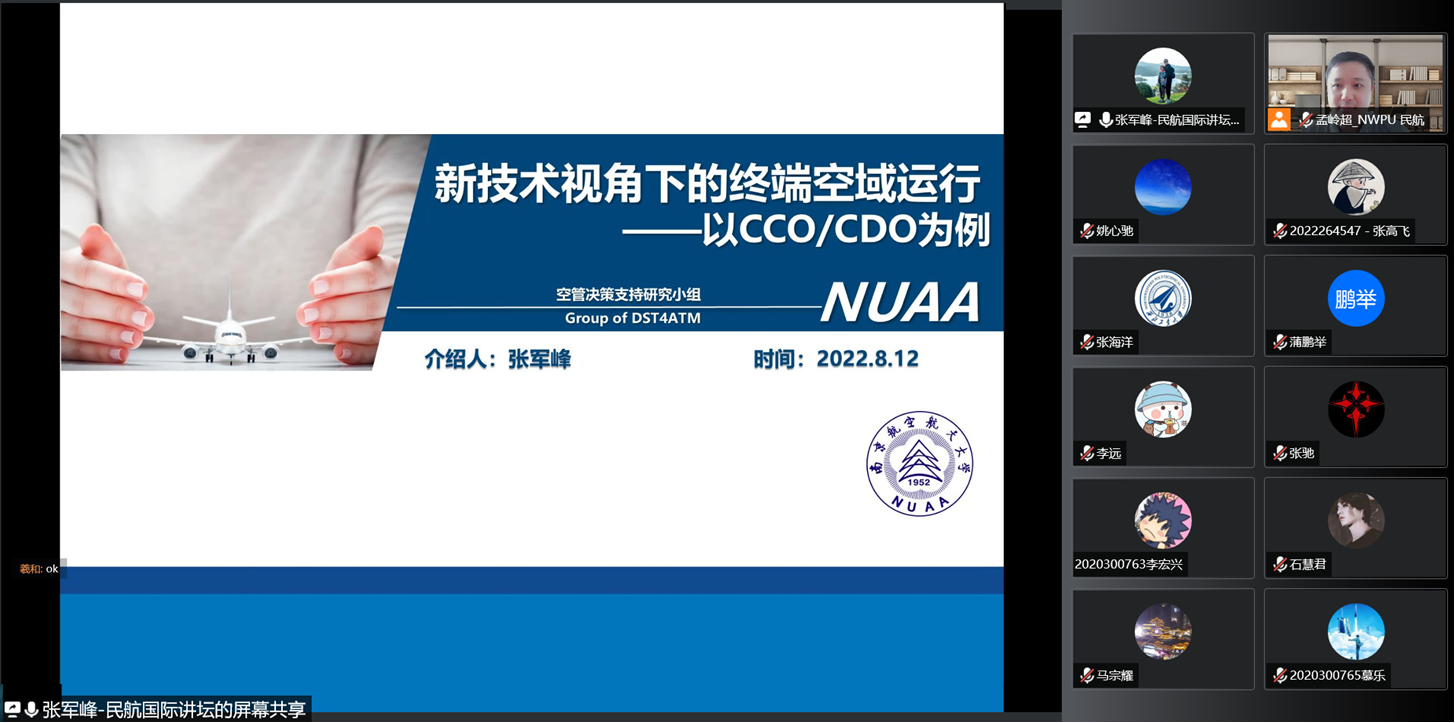 2022年8月12日,南京航空航天大学fun88官网体育张军峰副教授应公司孟岭超副教授邀请,为民航国际讲坛第十四讲作“新技术视角下的进场运行”线上讲座,公司广大师生参加了此次讲座。讲座由公司孟岭超副教授主持。
