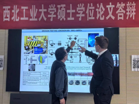 讲座结束后,李玉龙经理与两位主讲人就旋转臂实验设备及相关问题展开了更深入的讨论,沙明工老师也就如何精准控制雨蚀损伤范围这一问题与Mednikov Aleksei进行了探讨,相关师生围绕理论研究与两位专家进行了全方位的深入交流。由此,公司师生对俄罗斯目前的水滴侵蚀磨损与固体颗粒侵蚀研究进展有了进一步的了解。