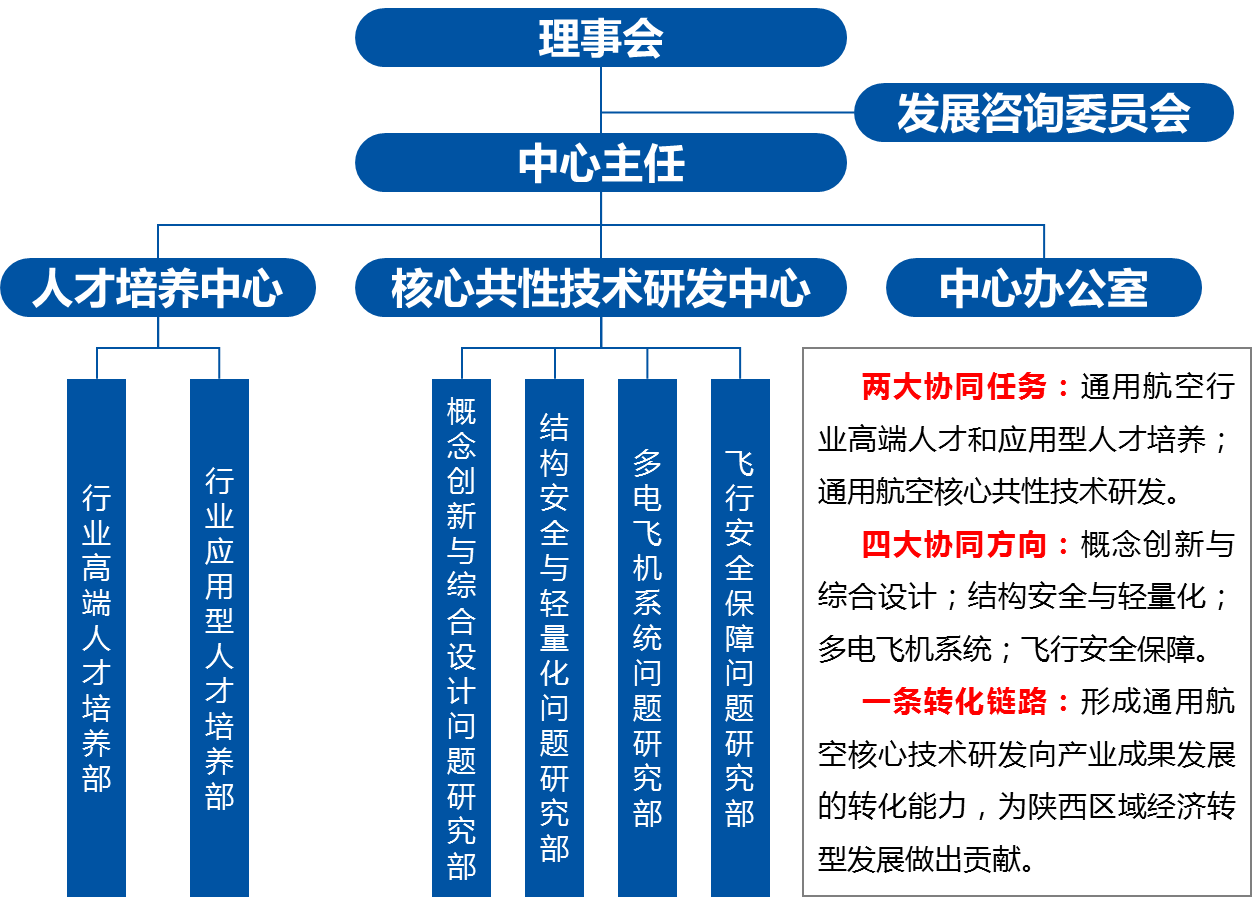 陕西通用飞机协同创新中心以通用飞机领域国家重大需求、未来10到20年世界一流水平的通用飞机核心共性技术需求为牵引,在陕西省政府主导下,依托fun88官网体育的相关优势学科,以概念创新与综合设计、结构安全与轻量化、多电飞机系统和飞行安全保障4项核心关键问题和人才培养为协同目标,与中国民用航空西北地区管理局、西安阎良国家航空高技术产业基地、渭南卤阳湖现代产业综合开发区管理委员会、西安航空公司、国家驻陕航空设计与制造企业主要创新力量及国际同领域顶尖研究力量深度融合,通过机制体制改革,有效汇聚人才、学科以及陕西省重点实验室资源,培养行业创新人才,产出一批重大标志性成果,提升高校人才、学科、科研三位一体的创新能力,成为具有国际一流水平的研究中心,为推动科教强省战略,实现创新型陕西的奋斗目标,提供强有力的智力支撑与人才保障。