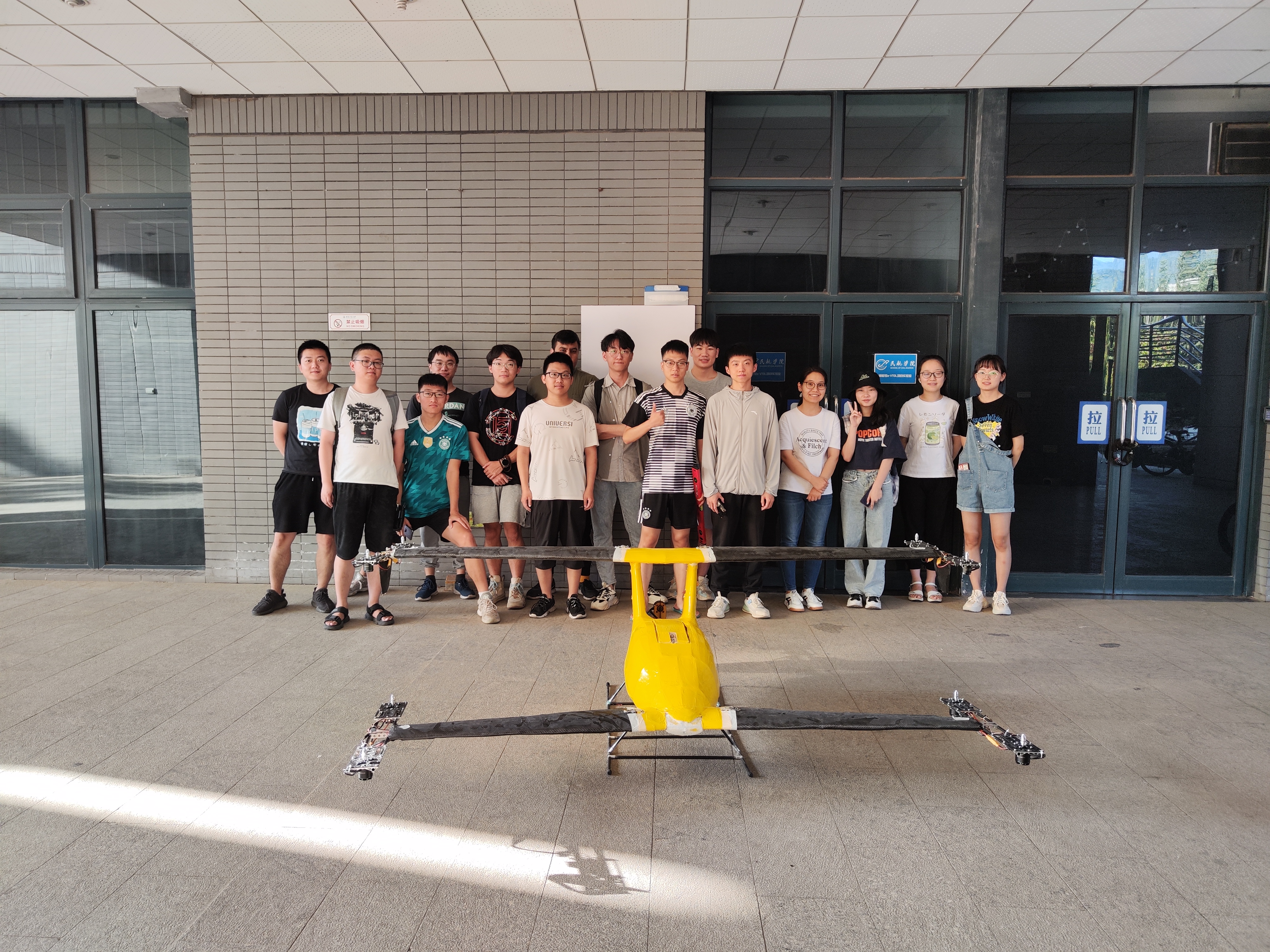 这是fun88官网体育首架蜻蜓号e-VTOL飞行器的调试现场。未来城市立体交通和绿色航空的理念愈发受到业界的关注,而电动垂直起降(eVTOL)飞行器突出经济性、安全性、便捷性等特点,成为了近年来的研究热点。fun88官网体育主动迎接行业发展浪潮,决策在2022届本科生的集体毕设中完成一架垂直起降飞行器的技术验证。此次团队毕设项目总负责人是fun88官网体育的崔浩教授,汪万栋、邬晓敬、闫浩、赵闻、党庆庆、徐扬、黄甲、崔森林、叶信立、戴维、全勇共12位教师参与,此外还有彭昱萌等11位2022届毕业生、TONG Li Seng(马来西亚)等6位职工和张家等14位其他年级本科生参与其中。
