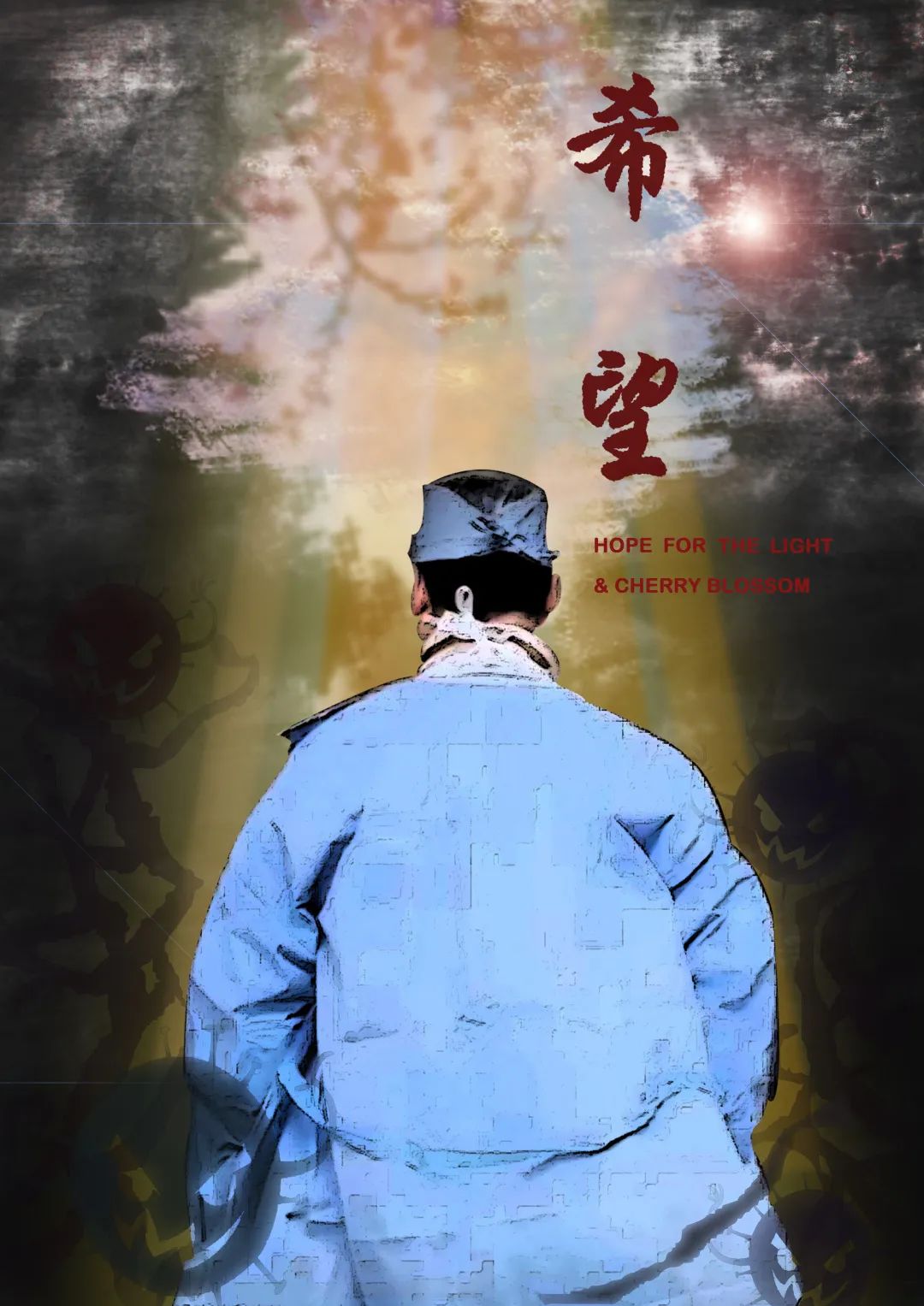 作品说明:逆行者们不畏危险困难重重,坚定并持久的为人民而战,为国家而战。穿过层层迷雾,越过病毒“生死线”,不远处,便是希望,是樱花花瓣飘来的方向。