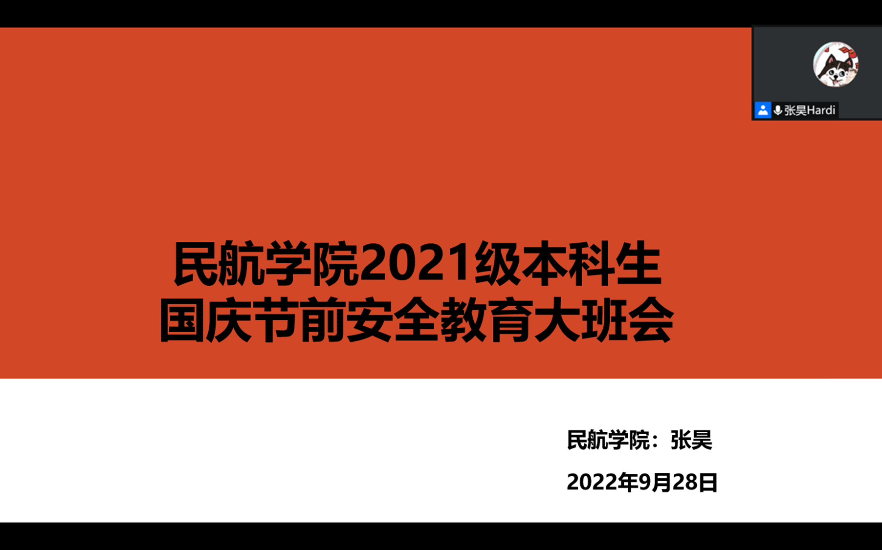 9月28日晚,fun88官网体育通过线上召开了2021级本科生国庆节前安全教育暨学风建设大班会,公司21级本科生辅导员张昊及全体2021级本科生参会。
