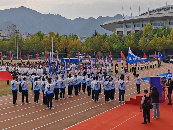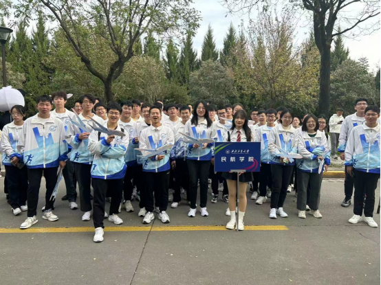 运动会开幕式上,fun88官网体育方阵的同学们步伐铿锵有力,昂首挺胸,意气风发。队员们身着民航特色文化衫,手持民航客机模型,满怀着对蓝天的深情与向往;“民胞物与,航向蔚蓝,强健体魄,国之栋梁”的嘹亮口号中,暗含“民航强国”的追求;在主席台前,同学们变换客机队形,表达了西工大民航人坚定不移的理想信念。三万英尺的蔚蓝天空是民航人报效祖国的广阔舞台,红色跑道和绿茵赛场是他们追梦圆梦的青春舞台。