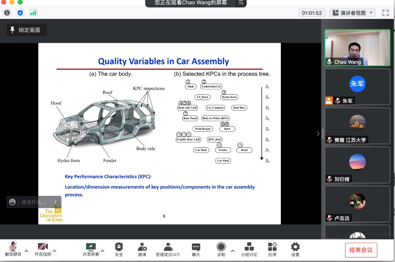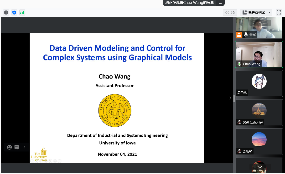 2021年11月4日上午,美国爱荷华大学工业系统工程系王超助理教授应邀至fun88官网体育作题为“概率图模型在复杂系统数据驱动建模和控制中的应用”的线上讲座。讲座由fun88官网体育朱军副教授主持。