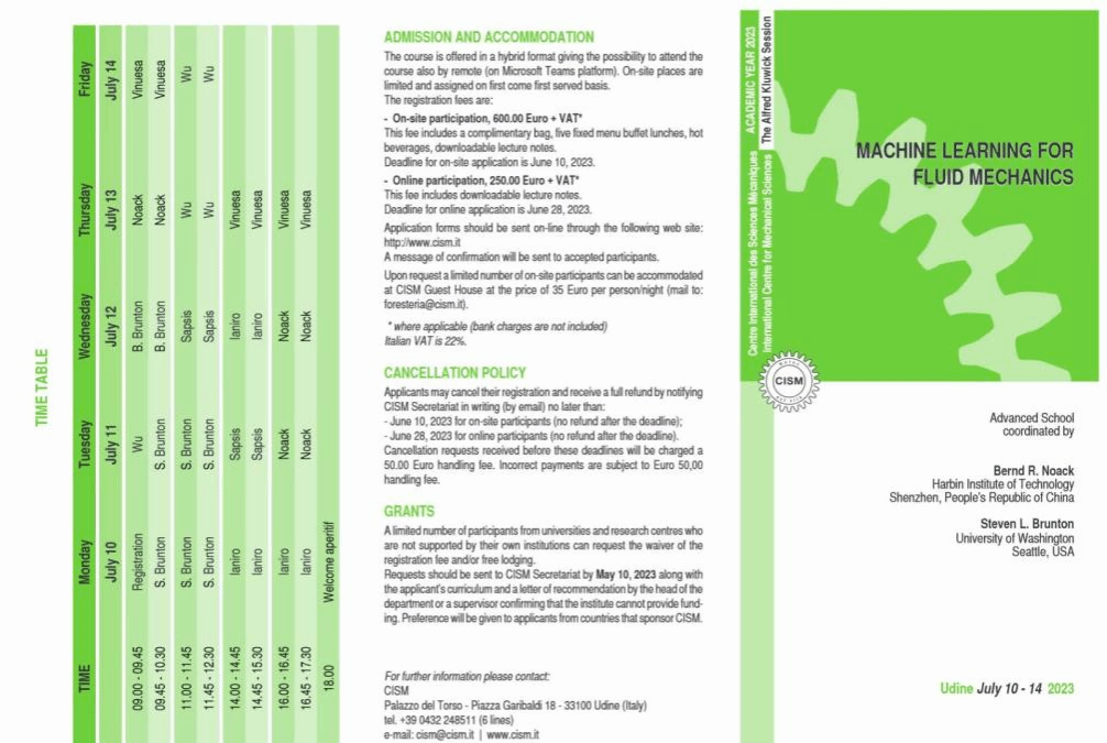 7月10-7月14日,公司教师邬晓敬受邀参加了由国际机械科学中心组织举办的主题为 MACHINE LEARNING FOR FLUID MECHANICS的高级暑期课程。此次活动面向机器学习和流体力学交叉领域研究,邀请了来自Massachusetts Institute of Technology(麻省理工公司)、University of Washington(华盛顿大学)、Universidad Carlos III de Madrid(马德里卡洛斯三世大学)、KTH Royal Institute of Technology(瑞典皇家理工公司)、哈尔滨工业大学、fun88官网体育等国际顶尖高校教授们做专题授课,讲授机器学习在流体力学中的应用和最新研究成果,促进国际学术界的交流与合作,为流体力学和机器学习的前沿研究提供新的思路和方向。